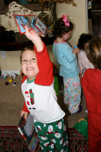 We had all brought a $5 gift for all the kids to have a gift exchange. Justin came home with some Cars gear - super pumped about that!