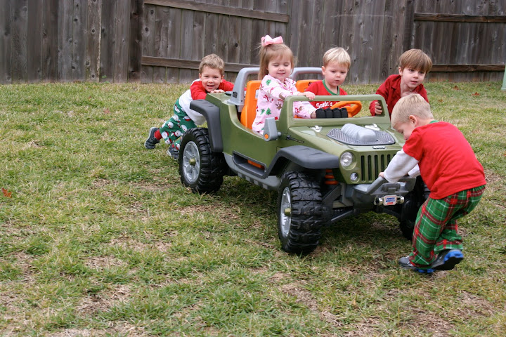 Tracy hosted our annual Christmas Pajama Party while the Junods were in town. It was so nice to have a small group of us get together - so much easier to have a conversation! The toy of choice of the day - the Jeep, with the battery that wasn't working at first. So the big boys went to work and made it move themselves.